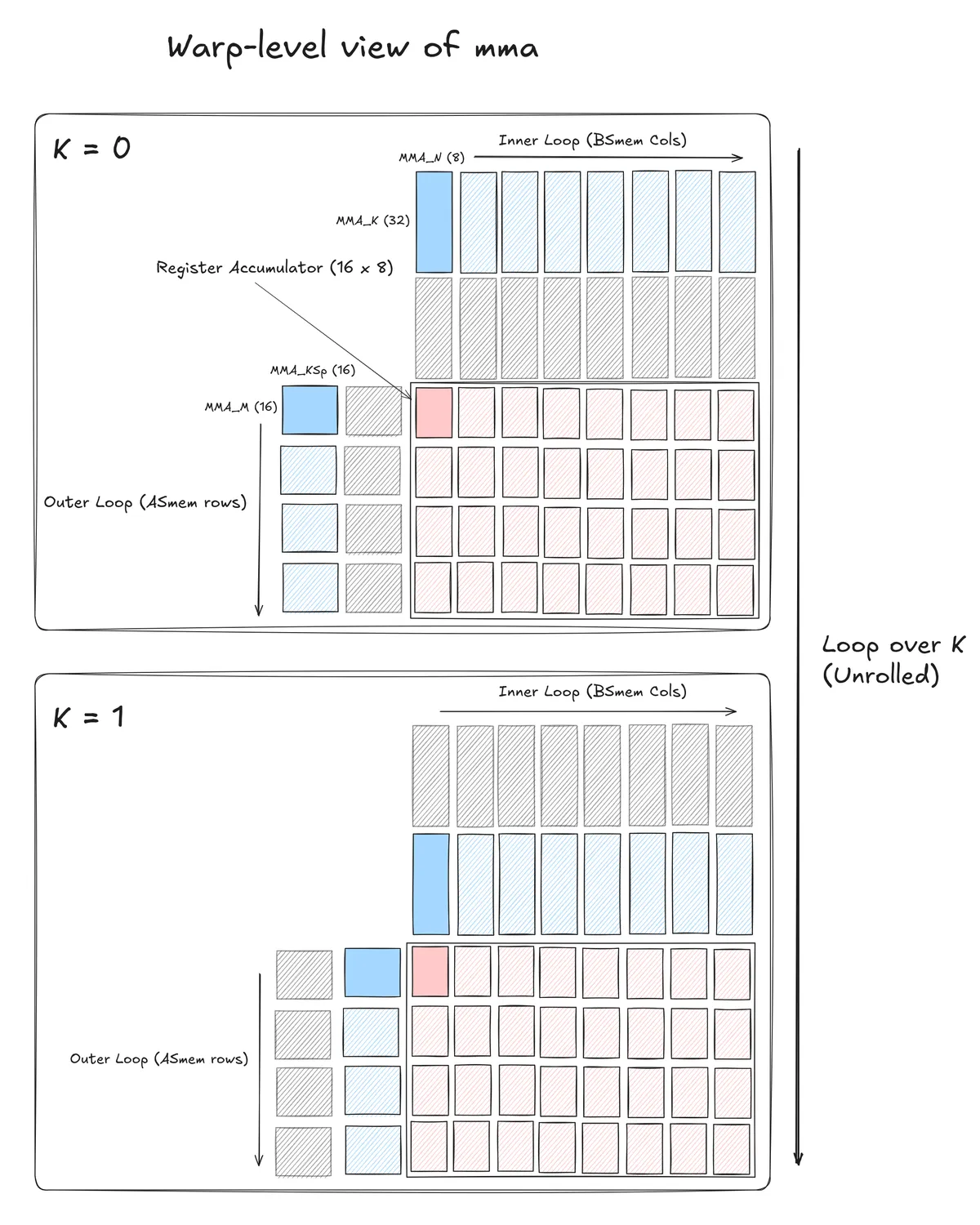 Note: An astute reader will notice that the thread : data layout is far from ideal. The current mapping is not compatible with any ldmatrix instruction, nor can it be loaded in a coalesced fashion. More on this later...